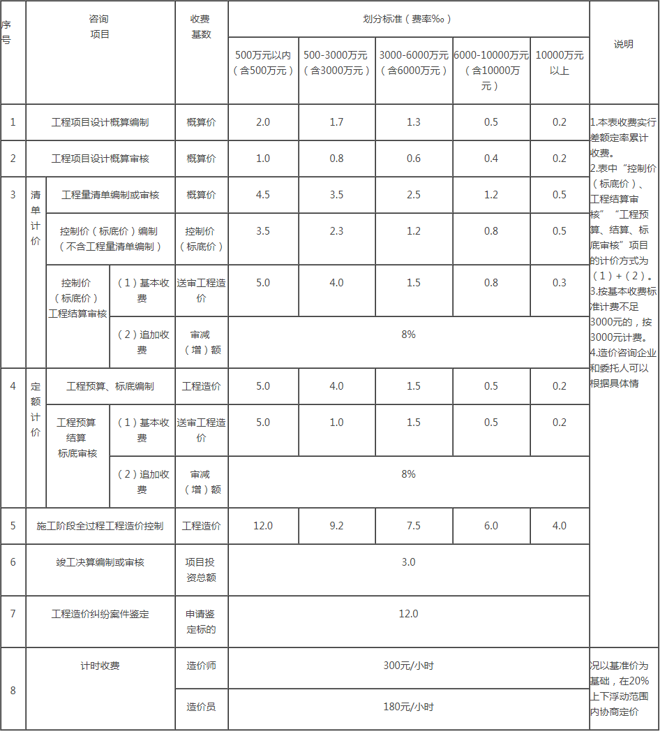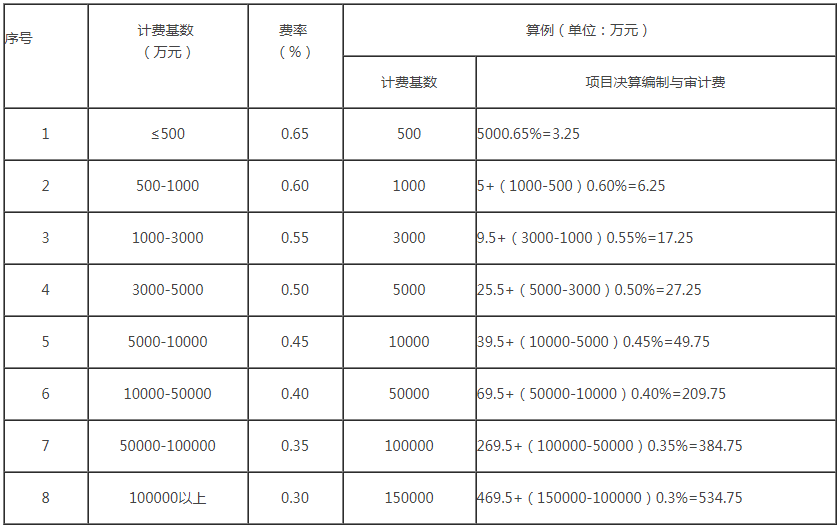 以工程施工費與設(shè)備購置費之和作為計費基數(shù),采用差額定率累進法計算。