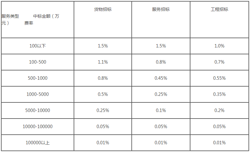 根據(jù)國家計委計價[2002]1980號文,工程招標代理服務(wù)收費以中標金額為基礎(chǔ)按差額定率分檔累進法計算,具體見下表: