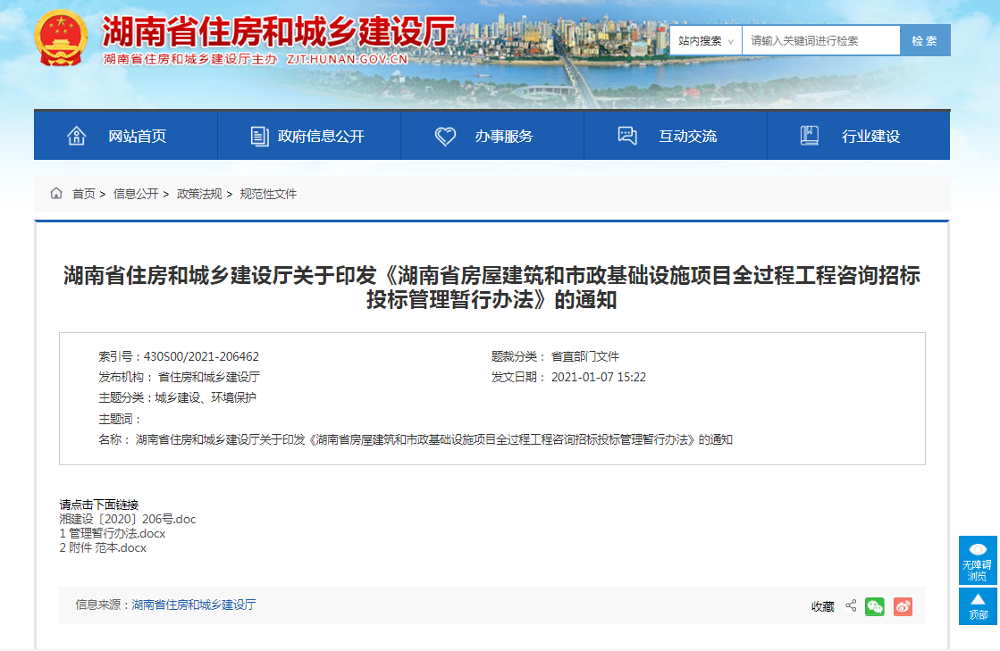第一條 為推進房屋建筑和市政基礎設施領域全過程工程咨詢發(fā)展,規(guī)范全過程工程咨詢招標投標活動,根據(jù)《中華人民共和國招標投標法》《中華人民共和國招標投標法實施條例》《建筑工程設計招標投標管理辦法》等法律法規(guī)和《國家發(fā)展改革委 住房城鄉(xiāng)建設部關于推進全過程工程咨詢服務發(fā)展的指導意見》、《湖南省人民政府辦公廳關于完善質量保障體系提升建筑工程品質的若干措施的通知》等文件,結合本省實際,制定本辦法。