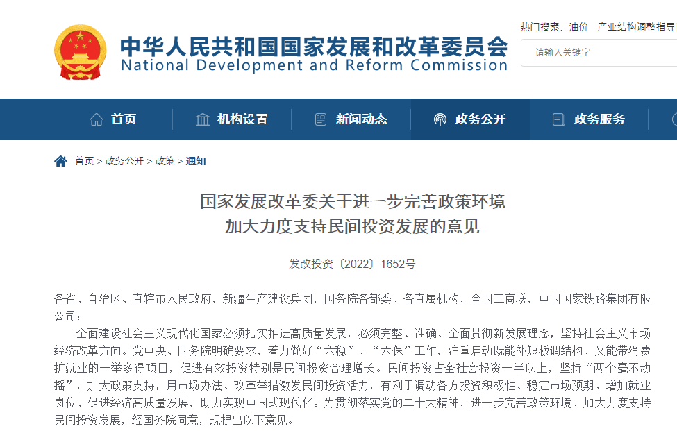 全面建設(shè)社會主義現(xiàn)代化國家必須扎實(shí)推進(jìn)高質(zhì)量發(fā)展,必須完整、準(zhǔn)確、全面貫徹新發(fā)展理念,堅(jiān)持社會主義市場經(jīng)濟(jì)改革方向。黨中央、國務(wù)院明確要求,著力做好“六穩(wěn)”、“六?!惫ぷ鳎⒅貑蛹饶苎a(bǔ)短板調(diào)結(jié)構(gòu)、又能帶消費(fèi)擴(kuò)就業(yè)的一舉多得項(xiàng)目,促進(jìn)有效投資特別是民間投資合理增長。民間投資占全社會投資一半以上,堅(jiān)持“兩個(gè)毫不動搖”,加大政策支持,用市場辦法、改革舉措激發(fā)民間投資活力,有利于調(diào)動各方投資積極性、穩(wěn)定市場預(yù)期、增加就業(yè)崗位、促進(jìn)經(jīng)濟(jì)高質(zhì)量發(fā)展,助力實(shí)現(xiàn)中國式現(xiàn)代化。為貫徹落實(shí)黨的二十大精神,進(jìn)一步完善政策環(huán)境、加大力度支持民間投資發(fā)展,經(jīng)國務(wù)院同意,現(xiàn)提出以下意見。