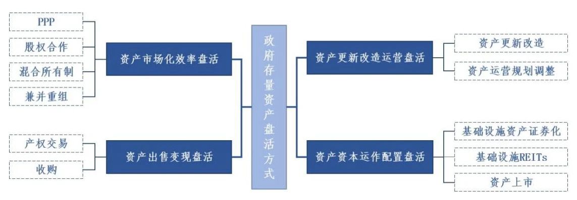 存量資產(chǎn)盤活償還是指采取各種方式來整合資產(chǎn)并且利用好現(xiàn)有的資產(chǎn),實(shí)現(xiàn)國(guó)有資產(chǎn)保值增值,利用回收資金償還政府隱性債務(wù)?;趪?guó)家政策文件,以及實(shí)踐經(jīng)驗(yàn),政府存量資產(chǎn)盤活方式總結(jié)為以下四大方式: