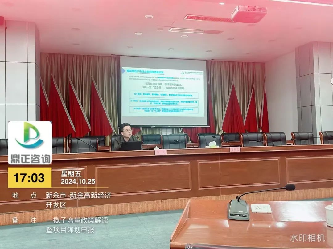 自9月下旬以來,國務(wù)院等多部門密集發(fā)布了一攬子增量政策,并引發(fā)了社會各界的廣泛關(guān)注。為搶抓增量政策窗口期,提升地方政府項目謀劃儲備質(zhì)量和項目謀劃水平,精準擴大有效投資。10月25日,鼎正副總經(jīng)理彭亮受邀為新余高新區(qū)政府作《一攬子增量政策解讀暨項目謀劃申報》的專題培訓。