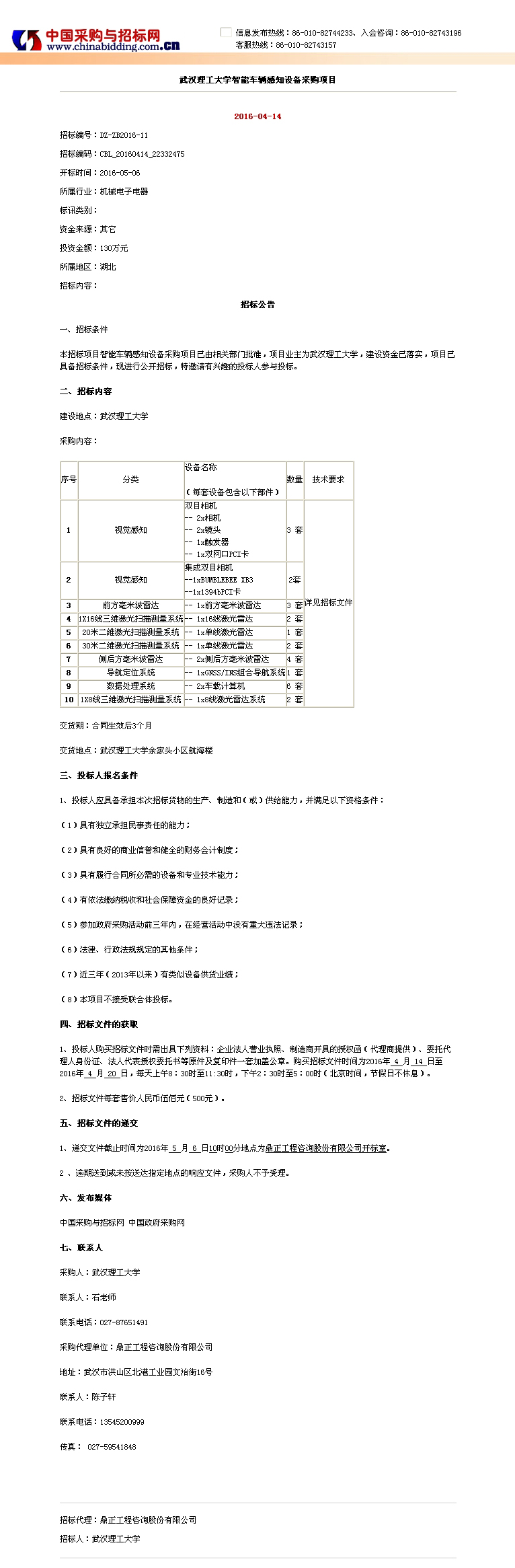 武漢理工大學(xué)智能車輛感知設(shè)備采購(gòu)項(xiàng)目招標(biāo)公告