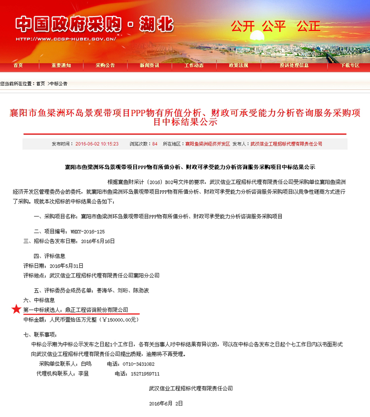 【經(jīng)營(yíng)成果】我司中標(biāo)襄陽市魚梁洲環(huán)島景觀帶項(xiàng)目PPP物有所值分析、財(cái)政可承受能力分析咨詢服務(wù)?采購(gòu)項(xiàng)目