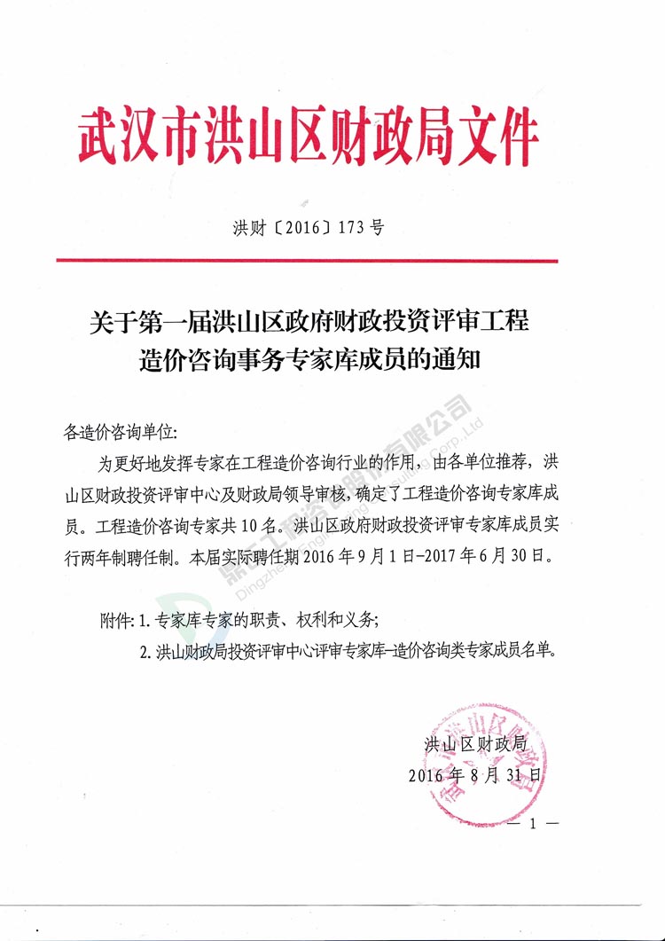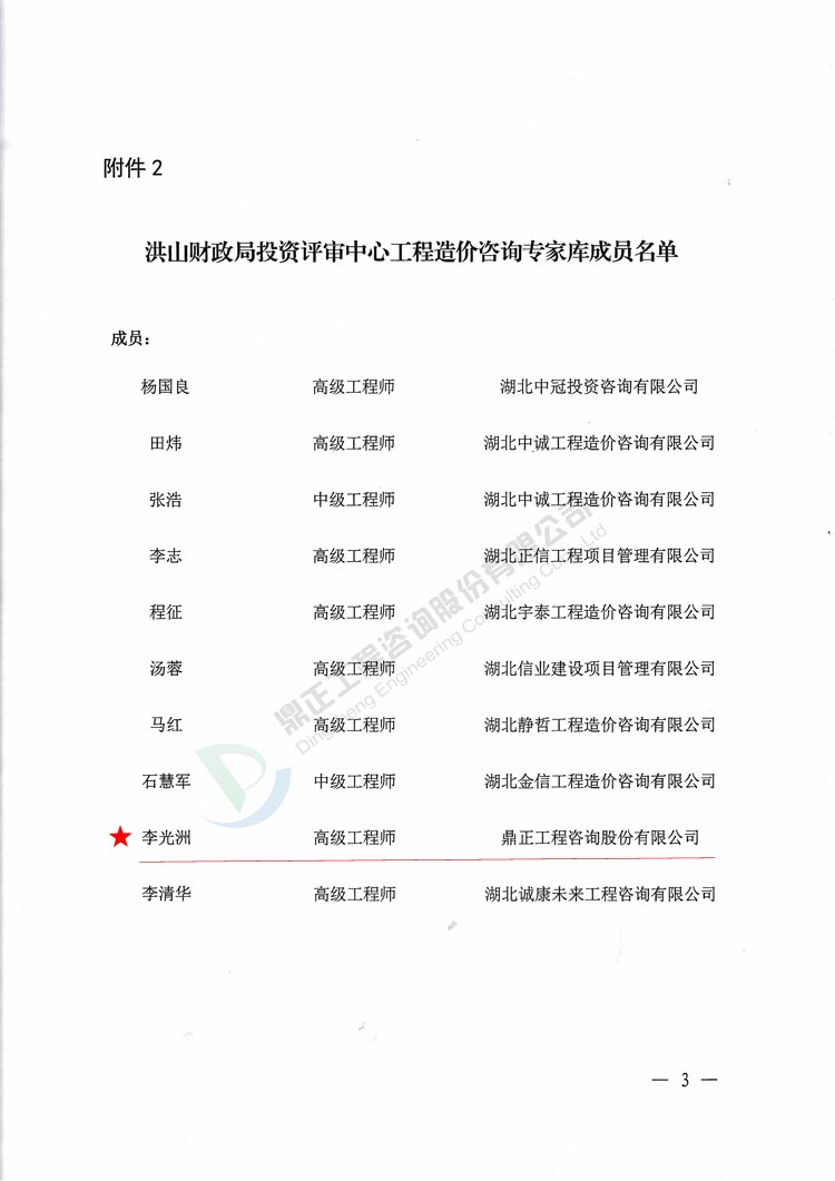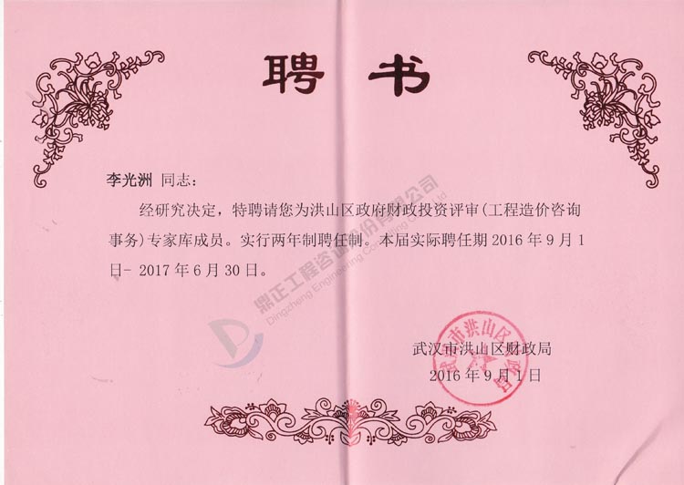 我司李光洲同志被武漢市洪山區(qū)財政局特聘為洪山區(qū)政府財政投資評審(工程造價咨詢事務(wù))專家