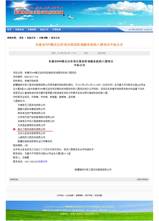近日,新疆維吾爾自治區(qū)采購網(wǎng)公布了阜康市PPP模式運(yùn)作項(xiàng)目策劃咨詢服務(wù)機(jī)構(gòu)入圍項(xiàng)目中標(biāo)公告,我司成功入圍。