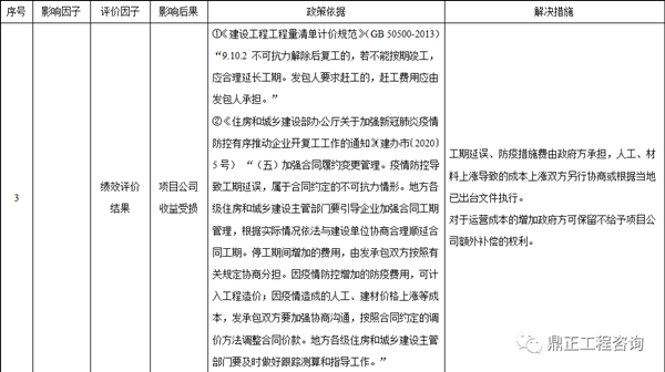 在控制最嚴(yán)的1-2月,全國(guó)大部分項(xiàng)目處于停工狀態(tài),即便通過后期補(bǔ)救措施適當(dāng)?shù)刳s工,但停工停業(yè)等行政命令在一定時(shí)期內(nèi)造成工期的延誤是必然的,也將影響政府方對(duì)PPP項(xiàng)目建設(shè)期績(jī)效評(píng)價(jià)的評(píng)分。