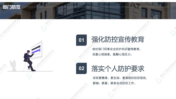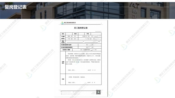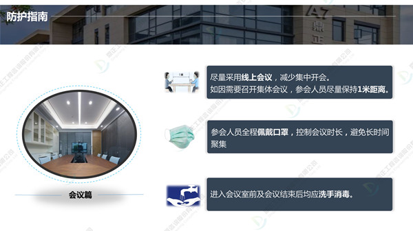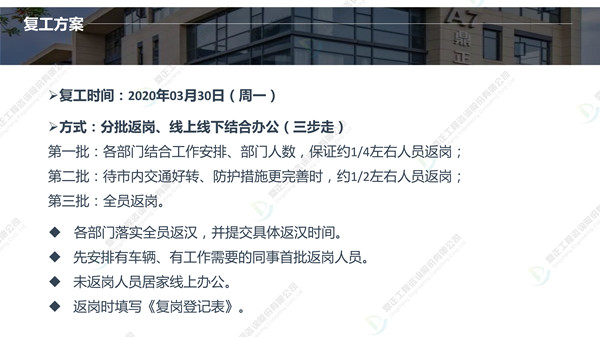分批返崗、線上線下結合辦公,鼎正人的復工準備工作正有序進行。在疫情防控、復工復產(chǎn)兩手抓的同時,鼎正咨詢將一如既往地為客戶提供專業(yè)的全過程工程咨詢服務。