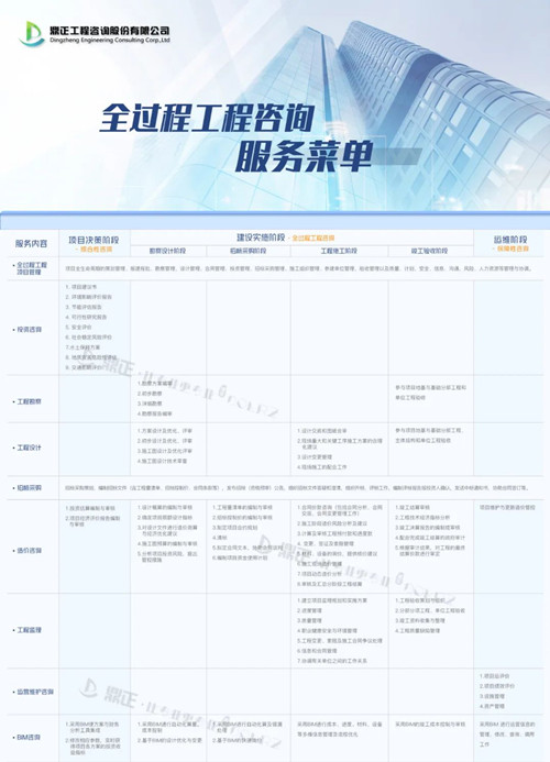 鼎正咨詢資質(zhì)資信及業(yè)務(wù)能力已覆蓋工程咨詢?nèi)a(chǎn)業(yè)鏈,可提供全過程工程咨詢、PPP全生命周期咨詢、項(xiàng)目策劃、工程投資咨詢 、土地利用規(guī)劃、城鄉(xiāng)規(guī)劃、工程設(shè)計(jì)、工程監(jiān)理、招標(biāo)代理、政府采購、工程造價(jià)咨詢、BIM咨詢等服務(wù)。