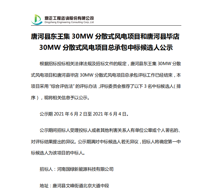 唐河縣東王集30MW分散式風(fēng)電項目和唐河縣畢店30MW分散式風(fēng)電項目總承包中標(biāo)候選人公示