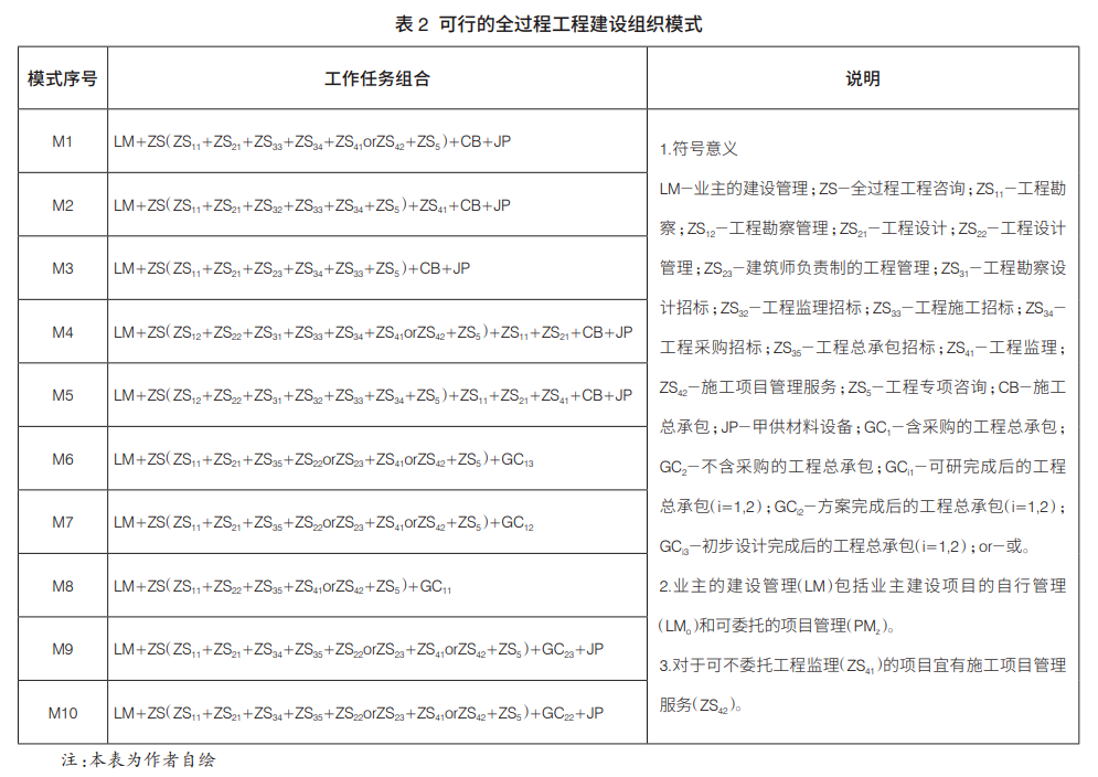 國(guó)家鼓勵(lì)多種形式的全過(guò)程工程咨詢服務(wù)模式,服務(wù)內(nèi)容可以是跨階段組合或同一階段內(nèi)不同類(lèi)型的組合。據(jù)筆者調(diào)查,目前業(yè)界認(rèn)可度較高的全過(guò)程工程咨詢內(nèi)容主要包括勘察設(shè)計(jì)、招標(biāo)采購(gòu)、監(jiān)理與施工項(xiàng)目管理服務(wù)以及工程專(zhuān)項(xiàng)咨詢。其中,工程勘察設(shè)計(jì)咨詢分為工程勘察設(shè)計(jì)和勘察設(shè)計(jì)管理服務(wù)兩種類(lèi)型;工程專(zhuān)項(xiàng)咨詢包括項(xiàng)目融資、工程造價(jià)、信息技術(shù)等業(yè)主所需求的咨詢服務(wù)?;谶@一認(rèn)識(shí),筆者梳理了建設(shè)、勘察設(shè)計(jì)、監(jiān)理、施工等單位在工程建設(shè)中的關(guān)系組合,并列出工程建設(shè)全過(guò)程主要的建設(shè)組織模式,如表2所示。