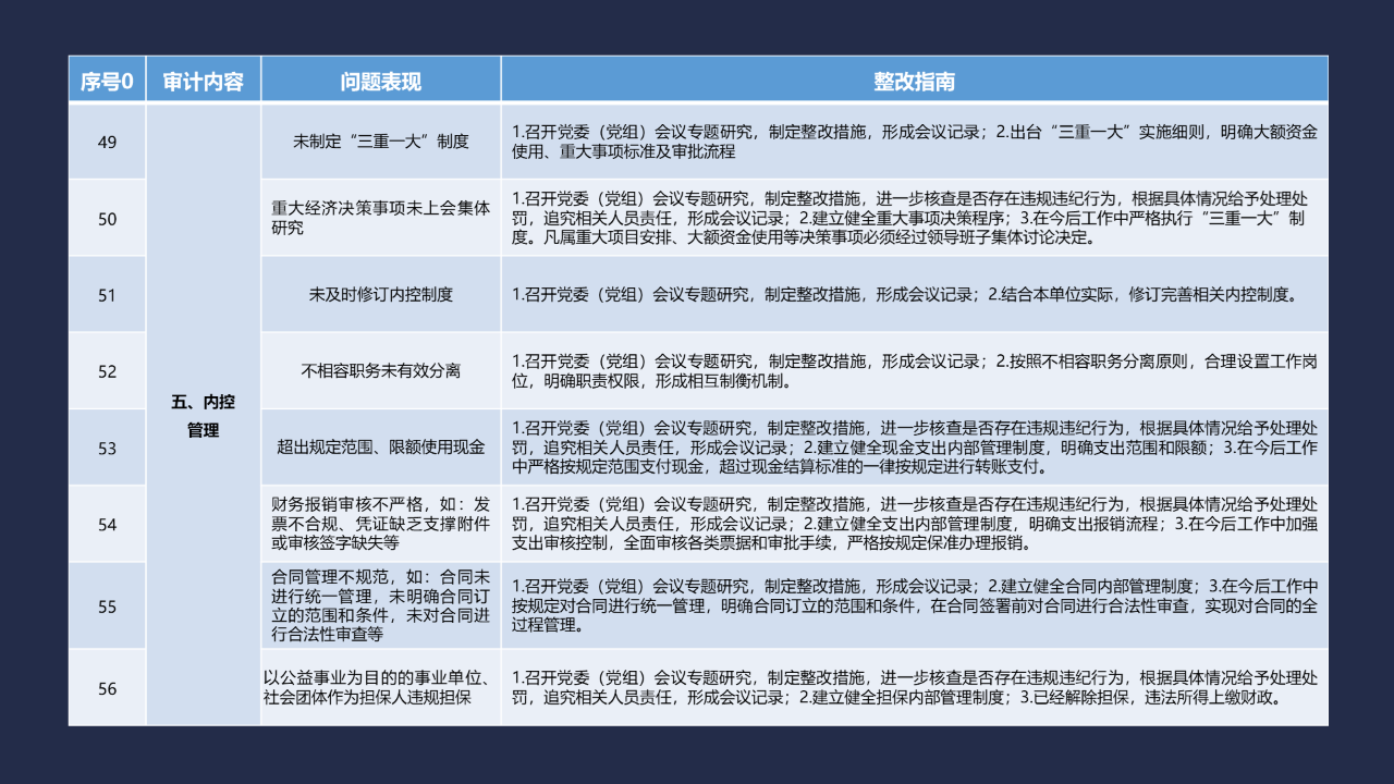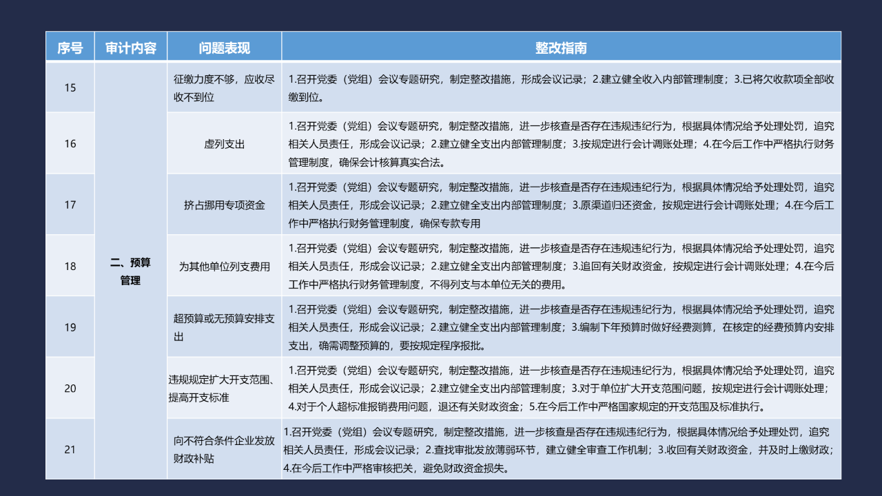 《整改指南100條》是在《江西省審計(jì)廳審計(jì)整改督查工作暫行辦法》(贛審綜發(fā)〔2021〕4號)第四章“審計(jì)整改認(rèn)定標(biāo)準(zhǔn)”有關(guān)規(guī)定的基礎(chǔ)上,結(jié)合審計(jì)整改工作實(shí)際,對常見審計(jì)查出問題的整改結(jié)果認(rèn)定標(biāo)準(zhǔn)進(jìn)行明確和細(xì)化?!墩闹改?00條》按照常見的重大政策措施落實(shí)、預(yù)算管理、政府采購及招投標(biāo)、基本建設(shè)、內(nèi)控管理、企業(yè)管理、自然資源、社保資金及安居工程、金融管理、國外貸援款共10類審計(jì)內(nèi)容進(jìn)行問題分類,列舉了100個(gè)常見問題并給出相對應(yīng)的整改標(biāo)準(zhǔn)說明,重點(diǎn)突出落實(shí)被審計(jì)單位整改主體責(zé)任、建立健全規(guī)章制度、推動問題全面整改等方面的內(nèi)容,審計(jì)機(jī)關(guān)和整改責(zé)任單位可以在審計(jì)整改工作中參照落實(shí)。