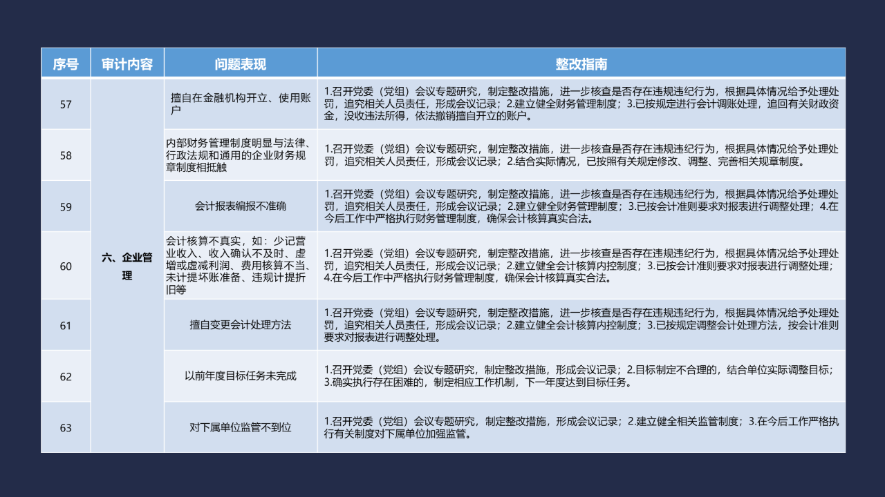 《整改指南100條》按照常見的重大政策措施落實(shí)、預(yù)算管理、政府采購及招投標(biāo)、基本建設(shè)、內(nèi)控管理、企業(yè)管理、自然資源、社保資金及安居工程、金融管理、國外貸援款共10類審計(jì)內(nèi)容進(jìn)行問題分類,列舉了100個(gè)常見問題并給出相對應(yīng)的整改方法說明,供審計(jì)機(jī)關(guān)和整改責(zé)任單位在審計(jì)整改工作中參照落實(shí)。