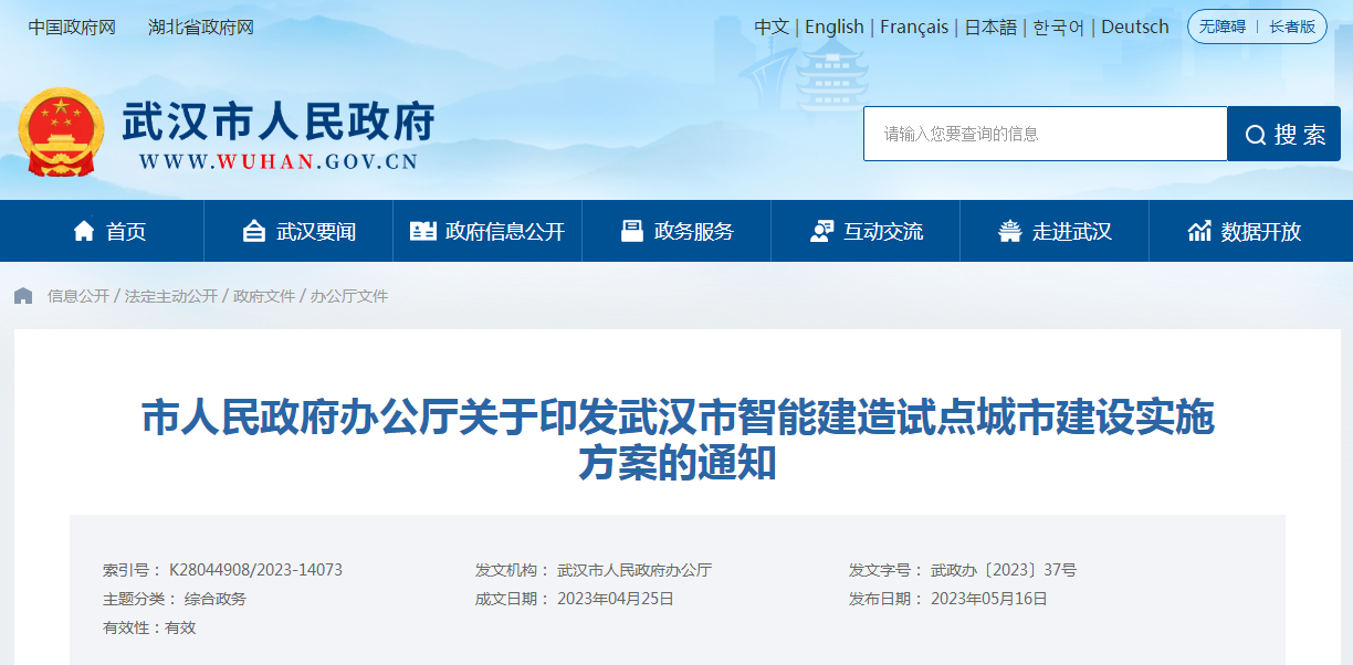 市人民政府辦公廳關于印發(fā)武漢市智能建造試點城市建設實施
