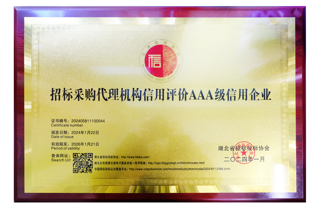 近日,鼎正憑借誠信的經(jīng)營理念、良好的企業(yè)信譽(yù)和優(yōu)質(zhì)的服務(wù)質(zhì)量,榮獲由湖北省招標(biāo)投標(biāo)協(xié)會認(rèn)定的最高等級“招標(biāo)采購代理機(jī)構(gòu)信用評價AAA級信用企業(yè)”稱號。