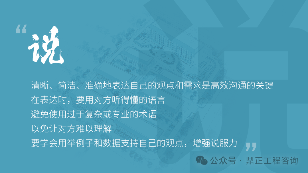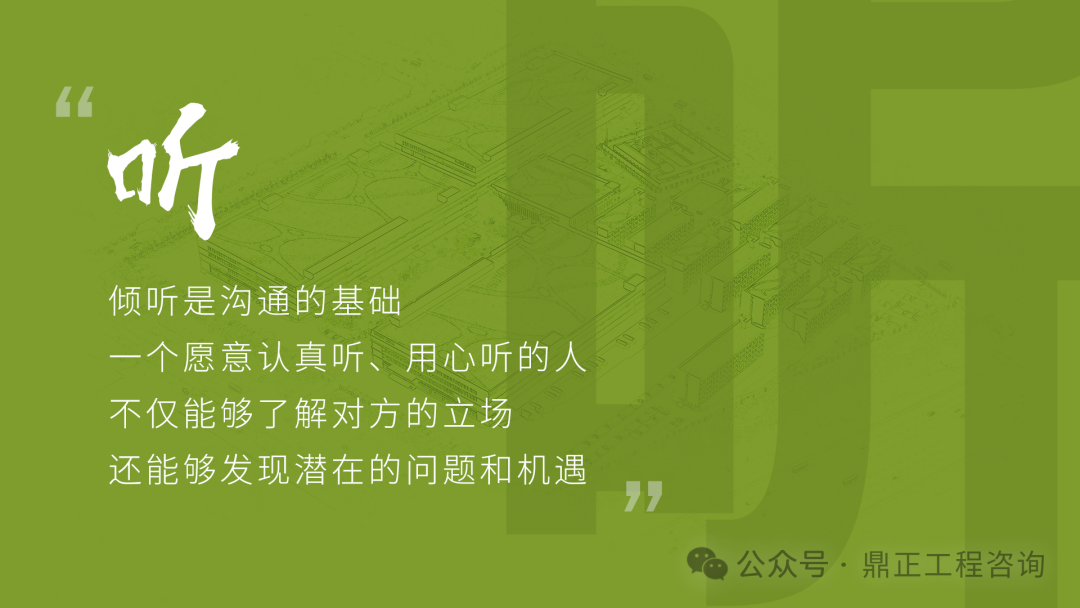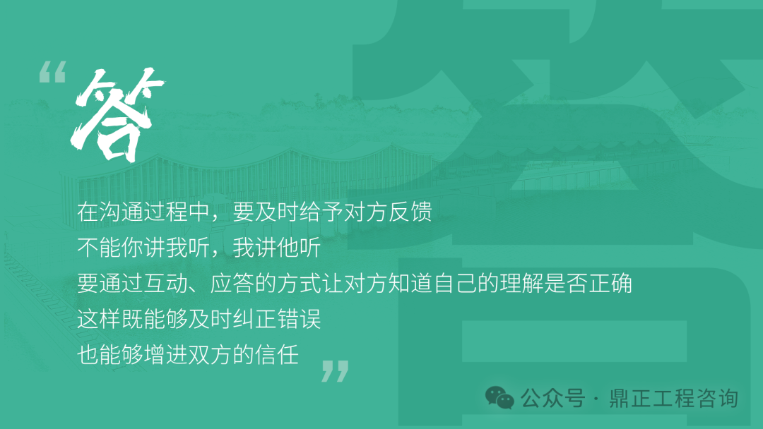 交流要看對象,不能對牛彈琴。與農(nóng)民工交流要用農(nóng)民工聽得懂的語言;與同行或其他咨詢機(jī)構(gòu)交流要用專業(yè)語言;與直接上級(jí)交流要及時(shí)反饋并提出合理建議;與客戶交流,要從客戶的視角出發(fā),為其提供最優(yōu)解決方案。