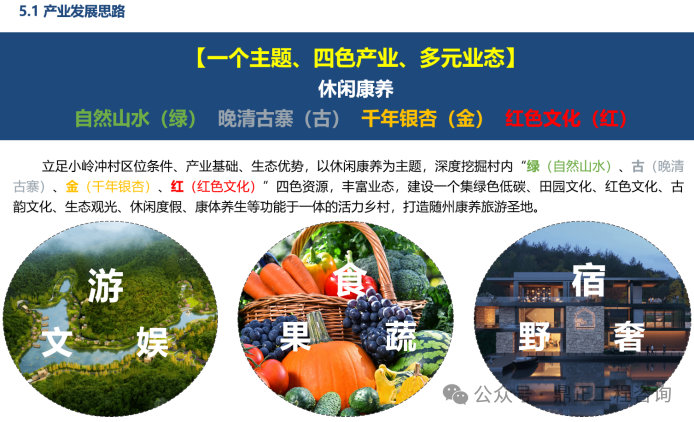 其中,雙河村通過(guò)發(fā)揮特色農(nóng)業(yè)產(chǎn)業(yè)優(yōu)勢(shì)建設(shè)農(nóng)業(yè)品牌,延伸農(nóng)業(yè)加工產(chǎn)業(yè)鏈開(kāi)啟創(chuàng)收新征程,積極發(fā)展鄉(xiāng)村休閑業(yè)打造詩(shī)意田園水鄉(xiāng),主要打造田園綜合體、濱河休閑體驗(yàn),拓展農(nóng)業(yè)休閑旅游業(yè)態(tài)。泉水寺村重點(diǎn)結(jié)合國(guó)家級(jí)專(zhuān)用汽車(chē)和應(yīng)急裝備檢測(cè)研發(fā)基地的建設(shè)基礎(chǔ),構(gòu)建以產(chǎn)業(yè)基地配套服務(wù)為主導(dǎo),以生態(tài)種養(yǎng)、休閑農(nóng)業(yè)為特色的產(chǎn)業(yè)體系。小嶺沖村重點(diǎn)整合“綠(自然山水)、古(晚清古寨)、金(千年銀杏)、紅(紅色文化)”四色資源,構(gòu)建“綠+古+金+紅”四色產(chǎn)業(yè),打造品質(zhì)活力鄉(xiāng)村旅游。九口堰村重點(diǎn)以豐富的紅色文化、自然資源為基礎(chǔ),以紅色文化體驗(yàn)為主導(dǎo)產(chǎn)業(yè),以文化帶動(dòng)旅游,拓展紅色體驗(yàn)、康養(yǎng)度假等產(chǎn)業(yè),打造全國(guó)紅色教育示范基地。