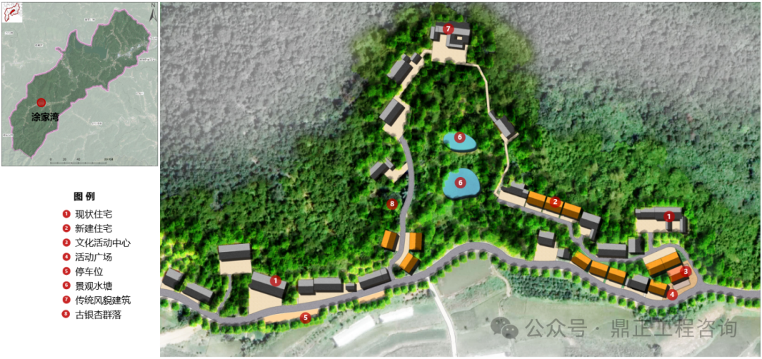 九口堰村為滿(mǎn)足村莊集并及遠(yuǎn)期人口增長(zhǎng)需求,規(guī)劃于涂家灣設(shè)置一處居民安置點(diǎn)。場(chǎng)地現(xiàn)狀民居較多,地形高差大,通過(guò)梳理現(xiàn)狀閑置宅基地、拆除破舊房屋等措施整理出可以進(jìn)行布局居民點(diǎn)的建設(shè)用地,點(diǎn)狀布局居民點(diǎn),居民點(diǎn)每戶(hù)占地140平方米,共安置12戶(hù)。
