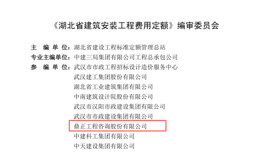 鼎正作為《湖北省園林綠化工程消耗量定額及全費用基價表》《湖北省建筑安裝工程費用定額》的參編單位之一,充分發(fā)揮全過程工程咨詢資源集中的優(yōu)勢,為此次定額的修訂貢獻了鼎正在全過程工程咨詢、工程造價咨詢業(yè)務(wù)領(lǐng)域編審設(shè)計概算、投資估算、工程預(yù)算、過程結(jié)算、竣工結(jié)算等實踐經(jīng)驗,對進一步完善工程造價計價依據(jù)體系提供了有力的技術(shù)支撐。