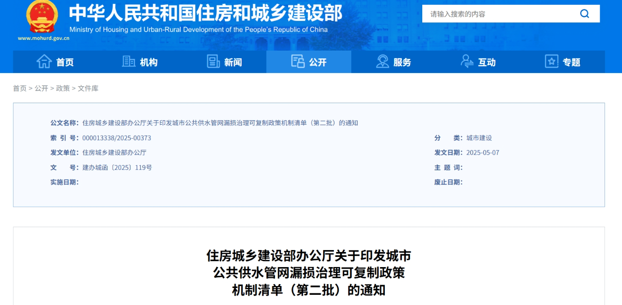 為加強(qiáng)城市公共供水管網(wǎng)漏損治理,健全長(zhǎng)效機(jī)制,近日,住房城鄉(xiāng)建設(shè)部、國(guó)家發(fā)展改革委遴選了50個(gè)城市和縣城重點(diǎn)推進(jìn),梳理形成了城市公共供水管網(wǎng)漏損治理可復(fù)制政策機(jī)制清單(第二批)。