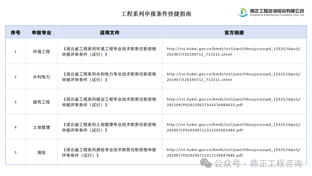 鄂職改辦已下發(fā)《湖北省職稱評審專業(yè)目錄》(鄂職改辦〔2021〕46號),其中工程系列已涵蓋環(huán)保、水利水電、建筑、土地、測繪、規(guī)劃等相關(guān)專業(yè),詳見下圖: