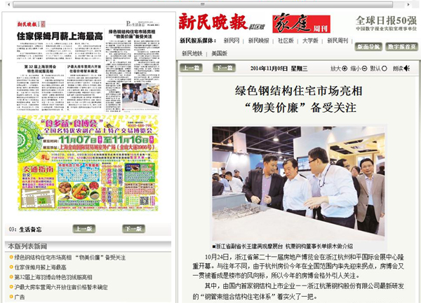 2014年11月5日,《新民晚報》第P03版《生活備忘》報道:《綠色鋼結(jié)構(gòu)住宅市場亮相? “物美價廉”備受關(guān)注》。