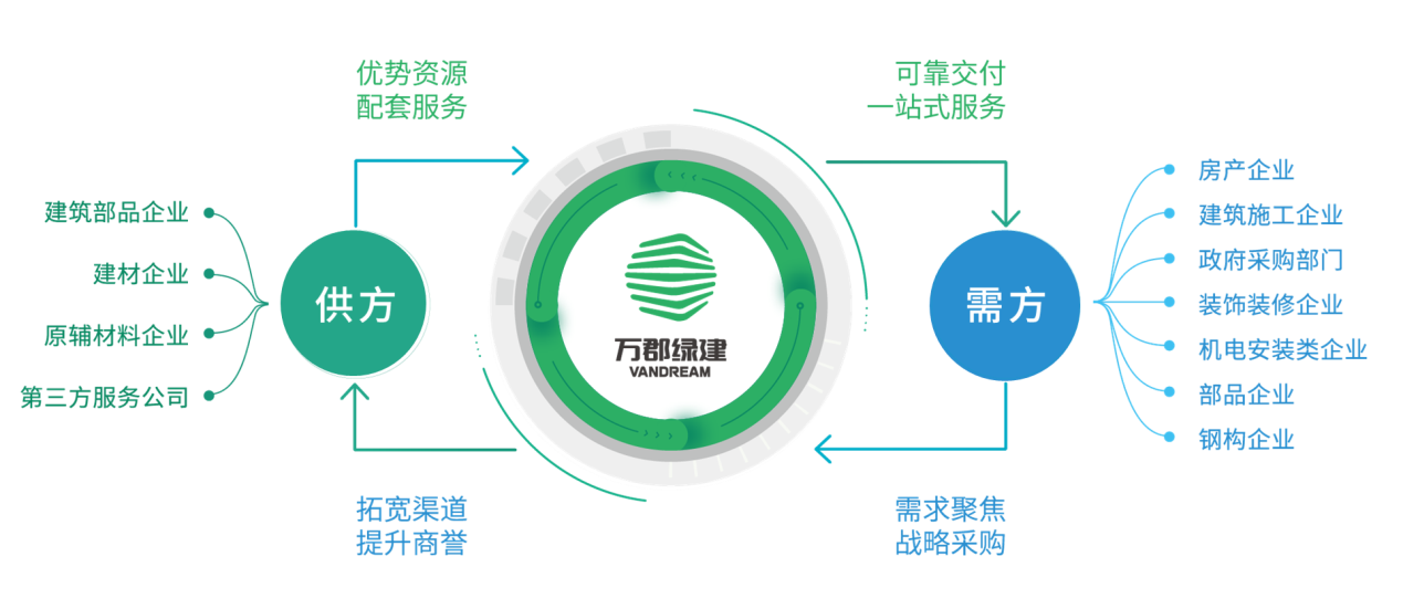 萬郡綠建通過透明交易、一站式采購、信息與大數(shù)據(jù)共享為采購降低成本,提高效率;通過全方位展示、多樣化互動、供應(yīng)鏈金融為供應(yīng)商拓寬渠道,提升商譽。同時萬郡綠建通過線上網(wǎng)站、交易平臺、產(chǎn)品體驗中心和公眾號三大服務(wù)平臺為專業(yè)的供應(yīng)鏈供需方交易保駕護航。