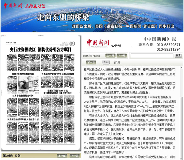 2015年1月22日,《中國新聞》第09版《專版》報道:《央行注資棚改區(qū) 鋼構(gòu)優(yōu)勢引各方矚目》。
