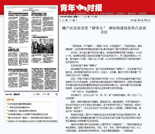 2015年2月9日,《青年時報(bào)》第06版《微杭州》報(bào)道:《棚戶區(qū)改造攻堅(jiān)“硬骨頭” 鋼結(jié)構(gòu)建筑優(yōu)勢凸顯獲關(guān)注》。