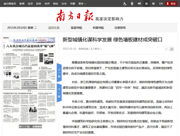 2015年2月10日《南方日報(bào)》第A03版《深圳觀察》報(bào)道:《新型城鎮(zhèn)化謀科學(xué)發(fā)展 綠色墻板建材成突破口》。