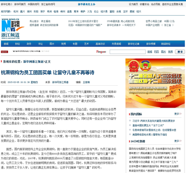 2015年3月5日,《新華網(wǎng)浙江頻道》報道:《杭蕭鋼構為員工團圓買單 讓留守兒童不再等待》。