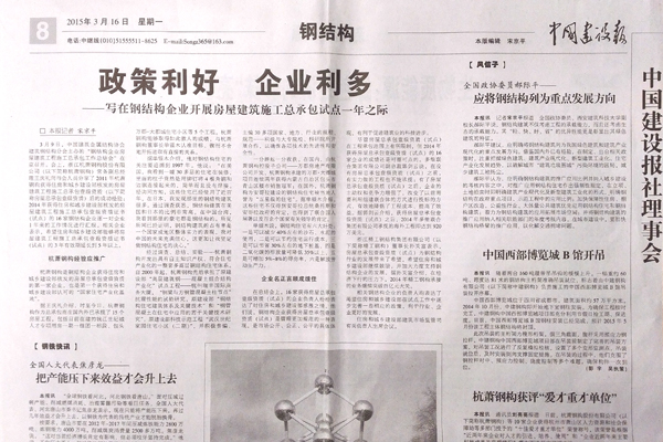 2015年3月16日,《中國(guó)建設(shè)報(bào)》第8版《鋼結(jié)構(gòu)》報(bào)道:《政策利好 企業(yè)利多——寫(xiě)在鋼結(jié)構(gòu)企業(yè)開(kāi)展房屋建筑施工總承包試點(diǎn)一年之際》。