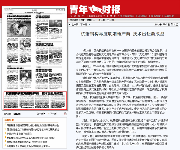 2015年3月23日,《青年時(shí)報(bào)》第A06版《微杭州》報(bào)道:《杭蕭鋼構(gòu)再度聯(lián)姻地產(chǎn)商 技術(shù)出讓漸成型》。