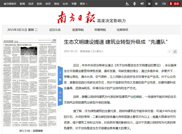 2015年3月31日,《南方日報》第A03版《深圳觀察》報道:《生態(tài)文明建設(shè)提速 建筑業(yè)轉(zhuǎn)型升級成“先遣隊”》。
