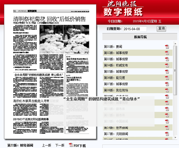 2015年4月3日,《沈陽(yáng)晚報(bào)》第22版《財(cái)經(jīng)新聞》報(bào)道:《“全生命周期”的鋼結(jié)構(gòu)建筑成就“青山綠水”》。