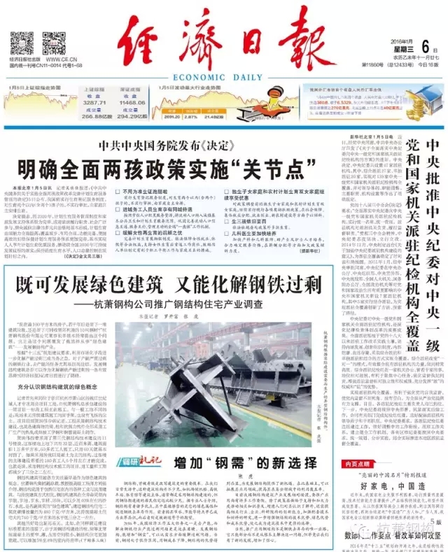 2016年1月6日,《經(jīng)濟(jì)日?qǐng)?bào)》頭版報(bào)道:《既可發(fā)展綠色建筑 又能化解鋼鐵過剩 ——杭蕭鋼構(gòu)公司推廣鋼結(jié)構(gòu)住宅產(chǎn)業(yè)調(diào)查》