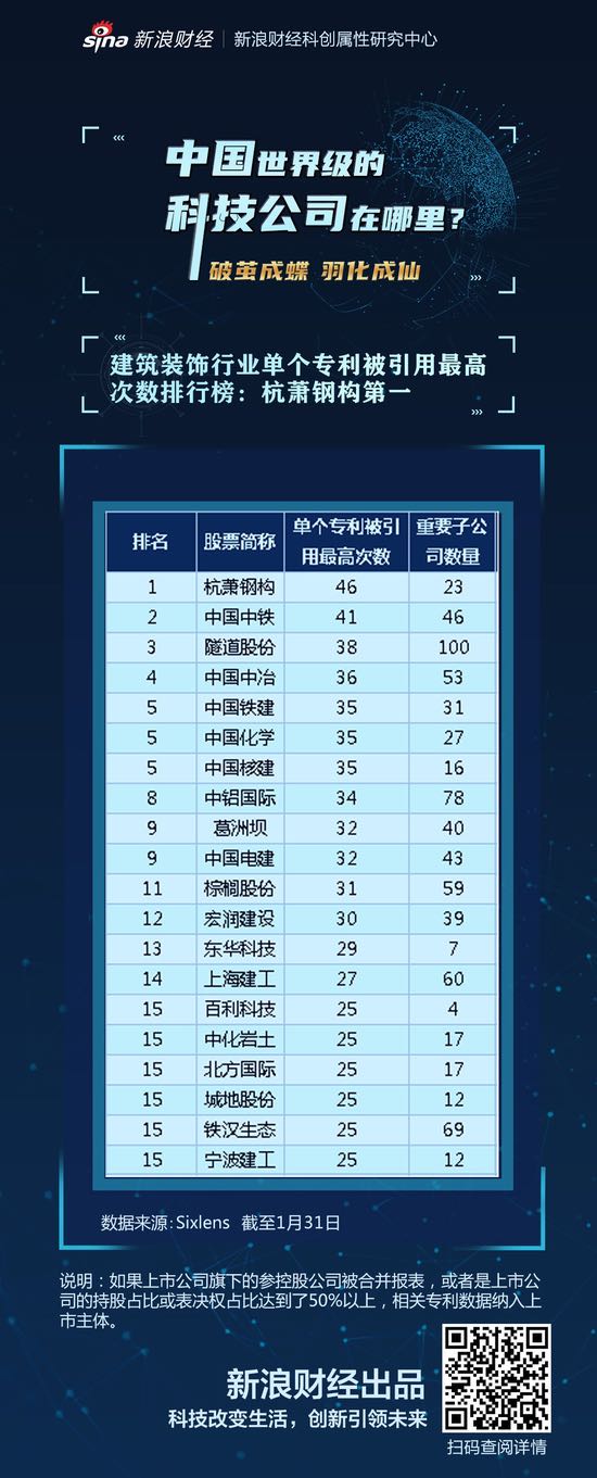 那么,建筑裝飾行業(yè)的各家公司單個專利被引用最高次數(shù)究竟如何呢?「新浪財經(jīng)科創(chuàng)屬性研究中心」將為你一一解答。