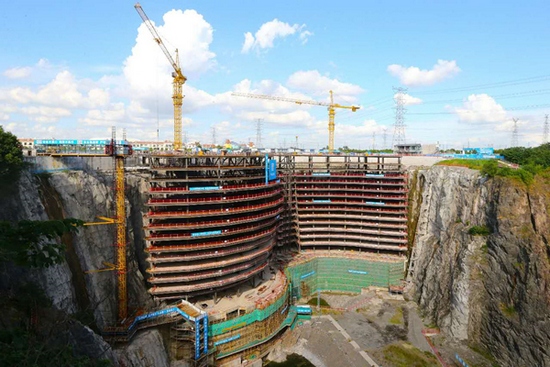 被譽(yù)為“世界建筑奇跡”的佘山深坑酒店建設(shè)駛?cè)搿翱燔嚨馈?,目前已?jīng)完成地下結(jié)構(gòu)封頂,世界海拔最低的五星級酒店建設(shè)全面提速,計(jì)劃于一個(gè)月內(nèi)完成主體結(jié)構(gòu)封頂。