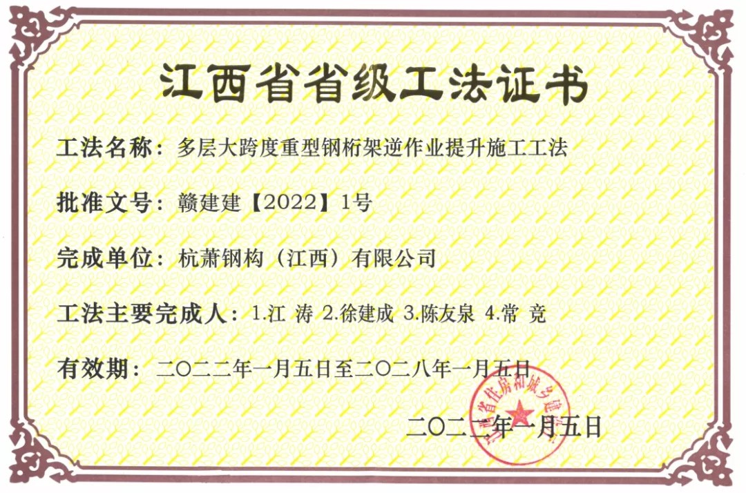 近期,經(jīng)江西省建設(shè)工程工法評審委員會審定,杭蕭鋼構(gòu)(江西)有限公司(以下簡稱“江西杭蕭”)江濤、徐建成、陳友泉、常競編寫的《多層大跨度重型鋼桁架逆作業(yè)提升施工工法》被江西省住房和城鄉(xiāng)建設(shè)廳批準(zhǔn)為2021年省級建設(shè)工法。
