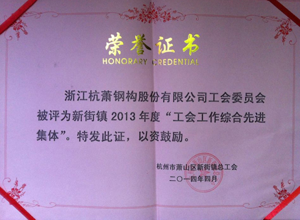 近日,新街鎮(zhèn)總工會(huì)召開(kāi)了2013年度工會(huì)工作先進(jìn)集體和先進(jìn)個(gè)人表彰大會(huì),浙江杭蕭鋼構(gòu)股份有限公司工會(huì)被評(píng)為2013年度“工會(huì)工作綜合先進(jìn)集體”,職工黃志偉被評(píng)為2013年度“優(yōu)秀職工”稱號(hào)。