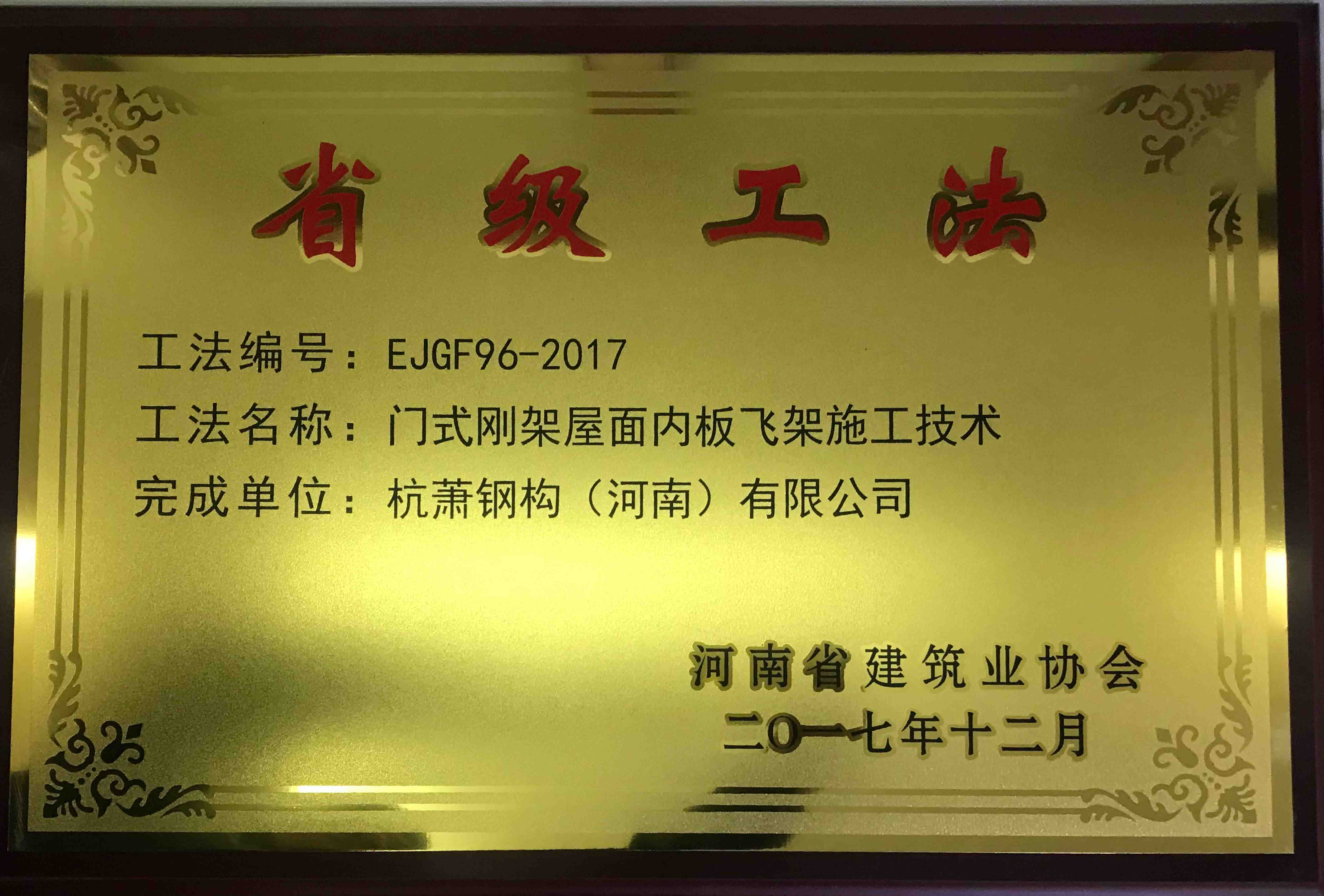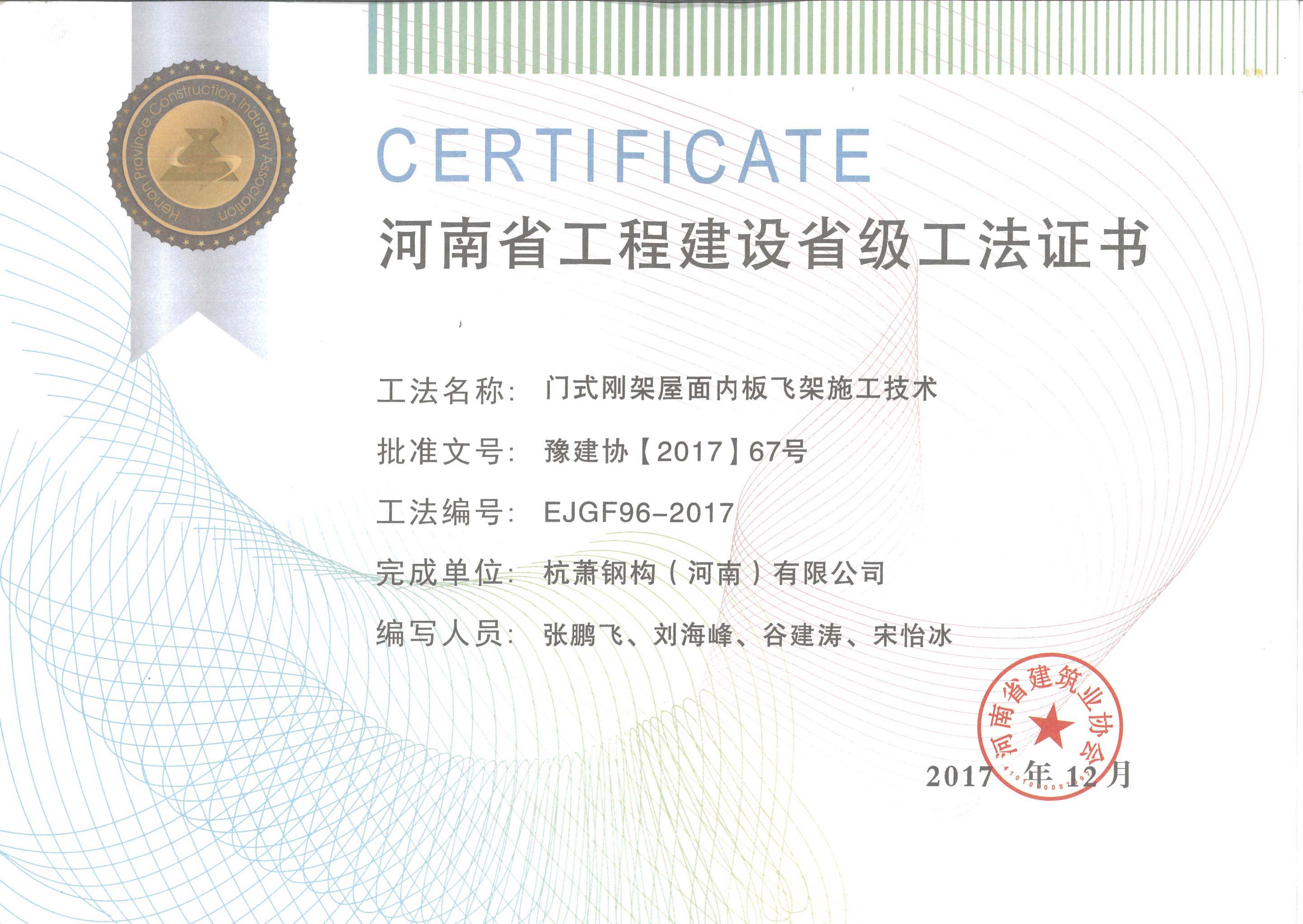 近日,河南省建筑業(yè)協(xié)會公布2017年度省級工法獲獎單位,由杭蕭鋼構(gòu)股份有限公司(以下簡稱“杭蕭鋼構(gòu)”)全資子公司——杭蕭鋼構(gòu)(河南)有限公司(以下簡稱“河南杭蕭”)張鵬飛、劉海峰、谷建濤、宋怡冰編寫的《門式鋼架屋面內(nèi)板飛架施工技術(shù)》獲得省級工法證書。