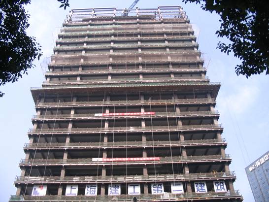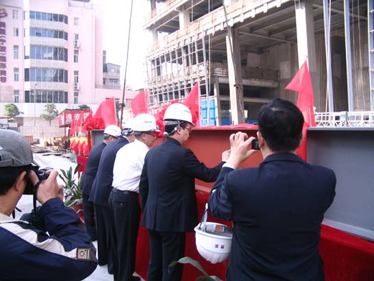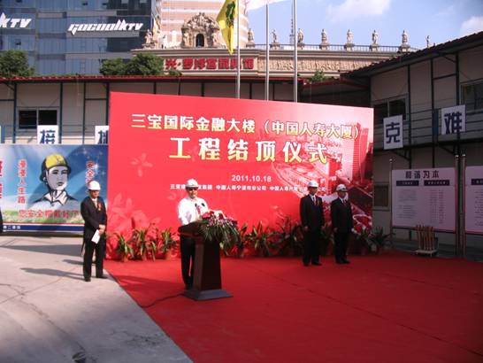 ??? 寧波三寶項目部代表公司于2011年7月15日與業(yè)主簽訂搶工協(xié)議,約定10月15日完成主樓結(jié)頂,業(yè)主獎勵公司30萬元。在公司相關(guān)部門、業(yè)主、監(jiān)理、總包單位的配合支持下,特別是漢德邦的樓層板的密切配合,我司項目部全體管理人員和施工隊工人經(jīng)過近三個月的共同努力,于10月13日提前兩天完成搶工協(xié)議約定的工程量內(nèi)容并于10月18日在現(xiàn)場如期舉行工程封頂儀式。