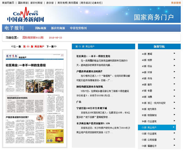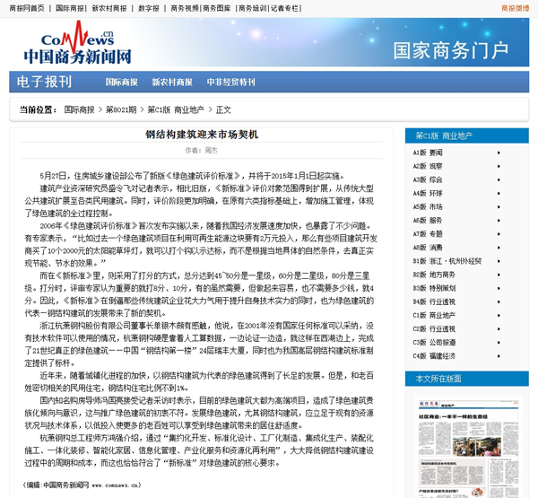 2014年6月23日,《國(guó)際商報(bào)》C1版《商業(yè)地產(chǎn)》報(bào)道:《鋼結(jié)構(gòu)建筑迎來(lái)市場(chǎng)契機(jī)》。