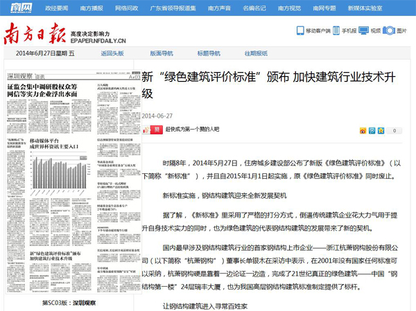 2014年6月27日,《南方日報》A03版《深圳觀察》報道:《新“綠色建筑評價標準”頒布 加快建筑行業(yè)技術(shù)升級》