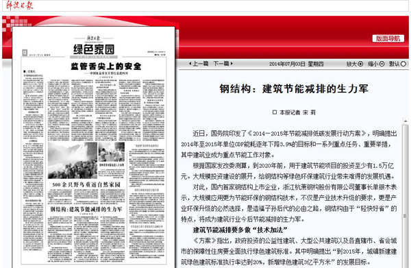 2014年7月3日,《科技日報(bào)》第12版《綠色家園》報(bào)道:《鋼結(jié)構(gòu):建筑節(jié)能減排的生力軍》。