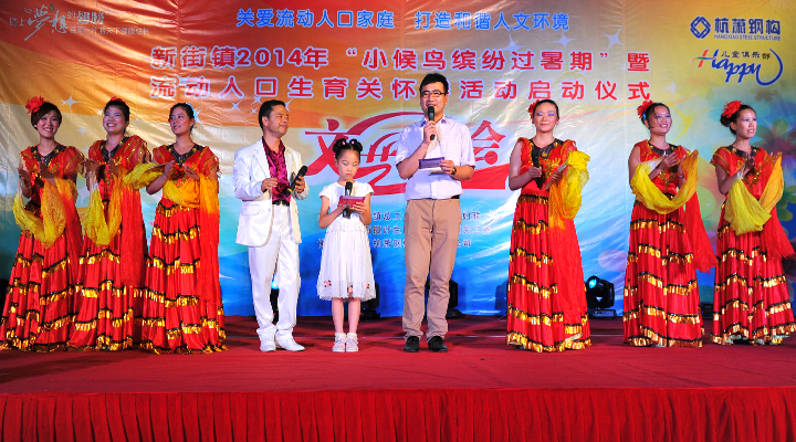 在這鳥(niǎo)語(yǔ)花香、風(fēng)雨和順的初夏時(shí)節(jié),由鎮(zhèn)總工會(huì)和公司工會(huì)聯(lián)合舉辦的新街鎮(zhèn)2014年“小候鳥(niǎo)·繽紛過(guò)暑期”暨流動(dòng)人口生育關(guān)懷季活動(dòng)啟動(dòng)儀式文藝晚會(huì)于浙江杭蕭鋼構(gòu)股份有限公司的宿舍區(qū)隆重舉行。新街鎮(zhèn)人大主席、計(jì)生協(xié)會(huì)會(huì)長(zhǎng)胡國(guó)創(chuàng)、蕭山區(qū)總工會(huì)副主席許紅、新街鎮(zhèn)黨委副書(shū)記、鎮(zhèn)總工會(huì)主席金飛、新街鎮(zhèn)黨委委員黃梅良、新街鎮(zhèn)黨委委員、副鎮(zhèn)長(zhǎng)陸姣英、杭蕭集團(tuán)副總裁、工會(huì)主席陳偉英以及股份公司人力資源總監(jiān)、工會(huì)副主席張超等出席此次晚會(huì)。