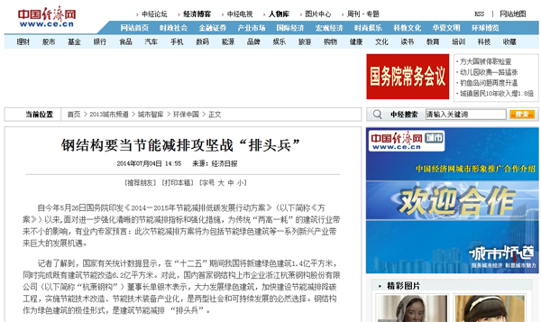 2014年7月4日,《中國經濟網(wǎng)》報道:《鋼結構要當節(jié)能減排攻堅戰(zhàn)“排頭兵”》。