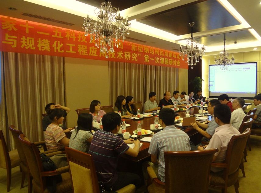 ??? 2012 年8 月29 日,國(guó)家十二五科技支撐計(jì)劃項(xiàng)目《新型鋼結(jié)構(gòu)民用建筑成套技術(shù)開(kāi)發(fā)與應(yīng)用》的課題“新型鋼結(jié)構(gòu)民用建筑設(shè)計(jì)與規(guī)?;こ虘?yīng)用技術(shù)研究”在杭蕭鋼構(gòu)舉行了第一次課題研討會(huì)。同濟(jì)大學(xué)、北京工業(yè)大學(xué)及浙江杭蕭鋼構(gòu)股份有限公司共23 位專家學(xué)者和技術(shù)人員參加了會(huì)議,此外,三位來(lái)自中國(guó)金屬結(jié)構(gòu)協(xié)會(huì)的代表出席了上午的活動(dòng)。