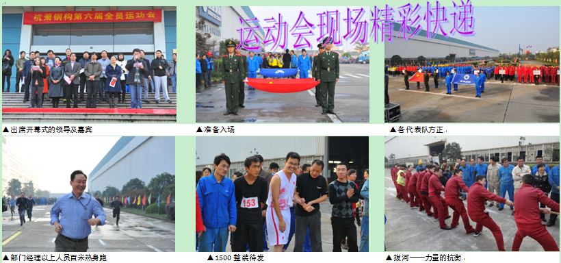 ??? 整個廠區(qū)彩旗飄揚,樂曲高奏,一片歡騰,在熱烈的氣氛中,杭蕭鋼構第六屆全員運動會隆重開幕了。本屆運動會為期兩天,共有10個代表隊,600名運動員參加了跑步、跳繩、象棋、球類、呼拉圈、拔河等18個項目的角逐。為杭蕭歷屆運動會參與人數(shù)最多的一次。