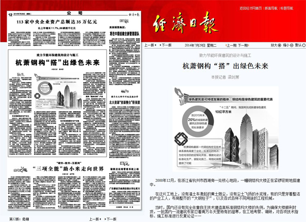 2014年7月29日,《經(jīng)濟日報》第12版《公司》報道:《杭蕭鋼構“搭”出綠色未來》。